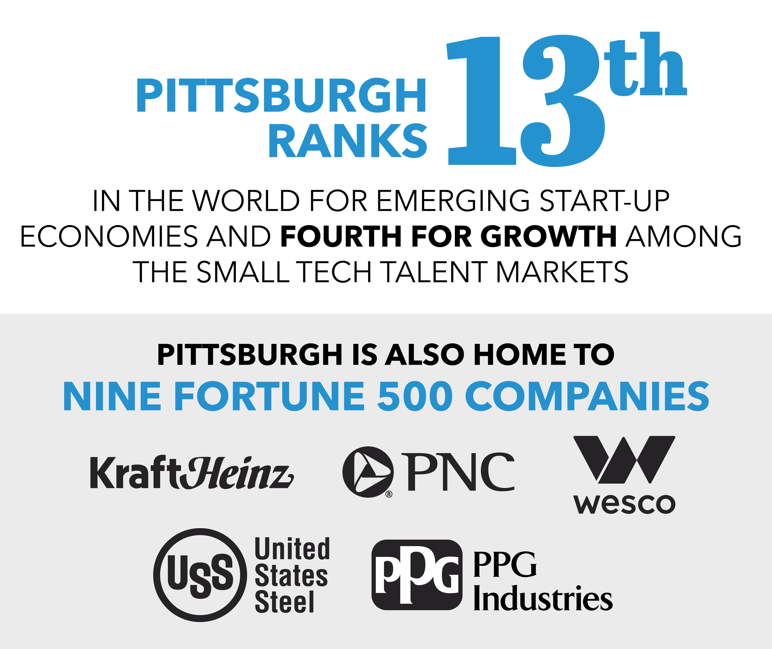 As Pittsburgh has continued to grow its economy, prominent corporations have flowed into the city and diversified away from industries that have historically made up a majority of the city’s economic activity. Over the past two decades, the city has invested heavily in growing its biotech and technology community. As a result, Pittsburgh ranks 13th in the world for emerging start-up economies and fourth for growth among the small tech talent markets. Between 2015 and 2020, Pittsburgh experienced an 11% increase in the total number of tech occupations, projected to continue to develop as more tech giants expand in the area, such as Uber, Zoom, Facebook, and more. In addition to an expanding tech sector, Pittsburgh is also home to nine Fortune 500 companies and corporate office locations for countless industry mammoths, positioning the city for long-term economic growth.